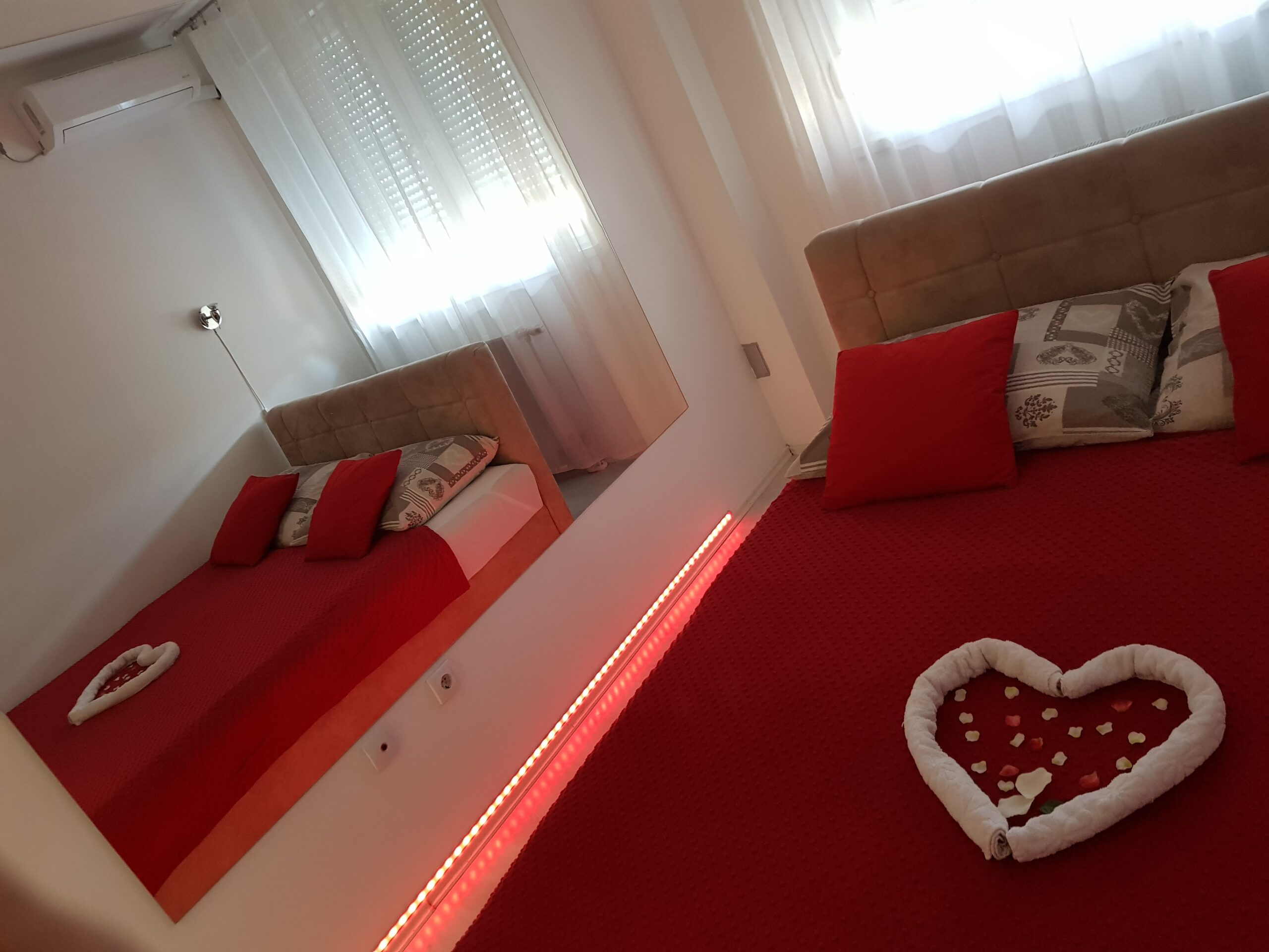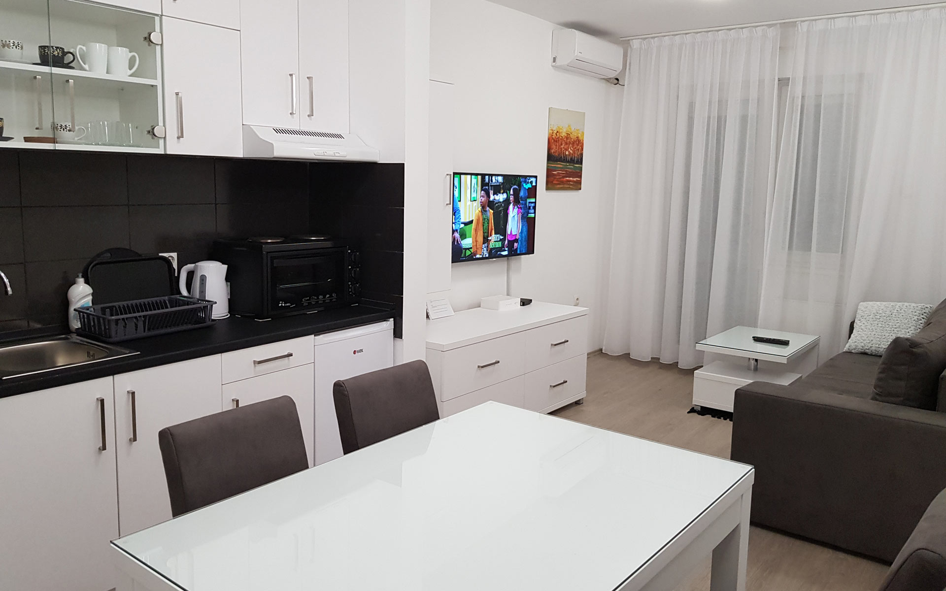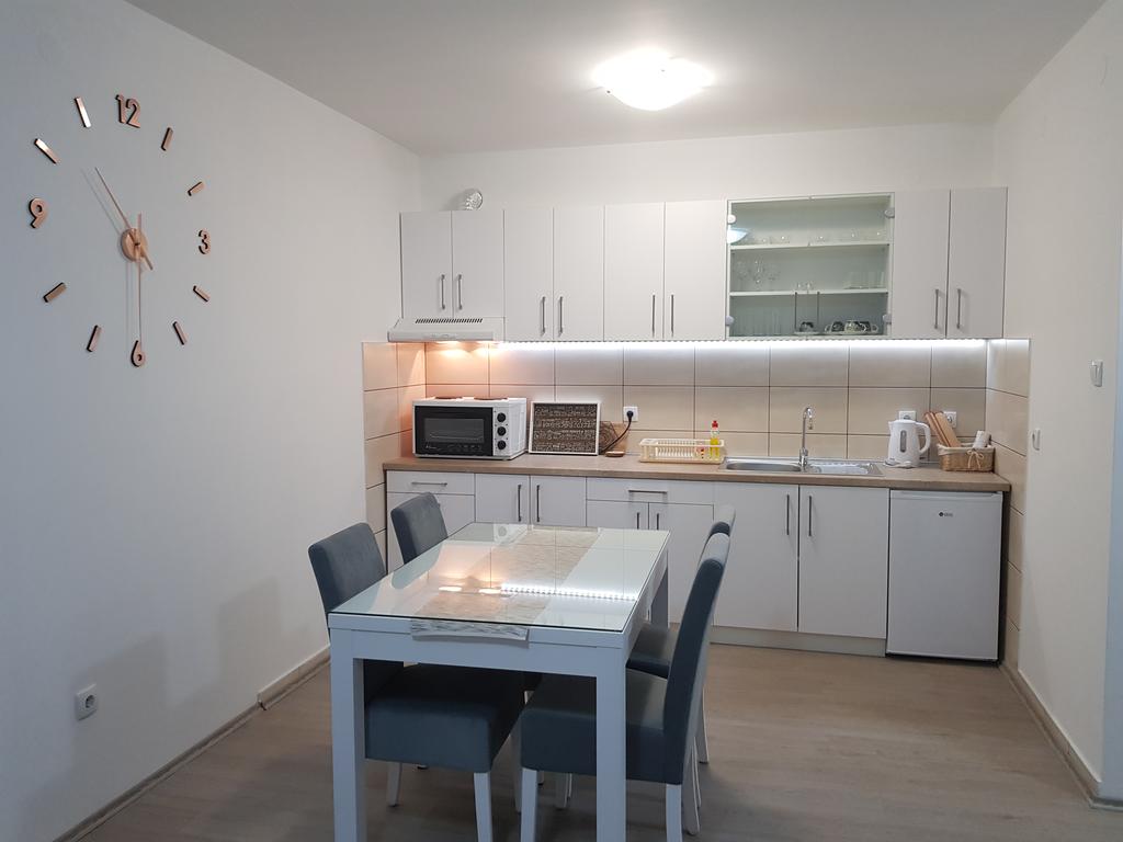 - Pogodnosti / Sadržaji: Besplatan Wi-Fi, Dormeo prostirke, Fen, Frižider, Kablovska, Klima uređaj, Mini šporet sa rernom, Papuče, Parking (uz doplatu), Pegla i daska za peglanje, Peškiri, Terasa, TV (LED), Veš mašina