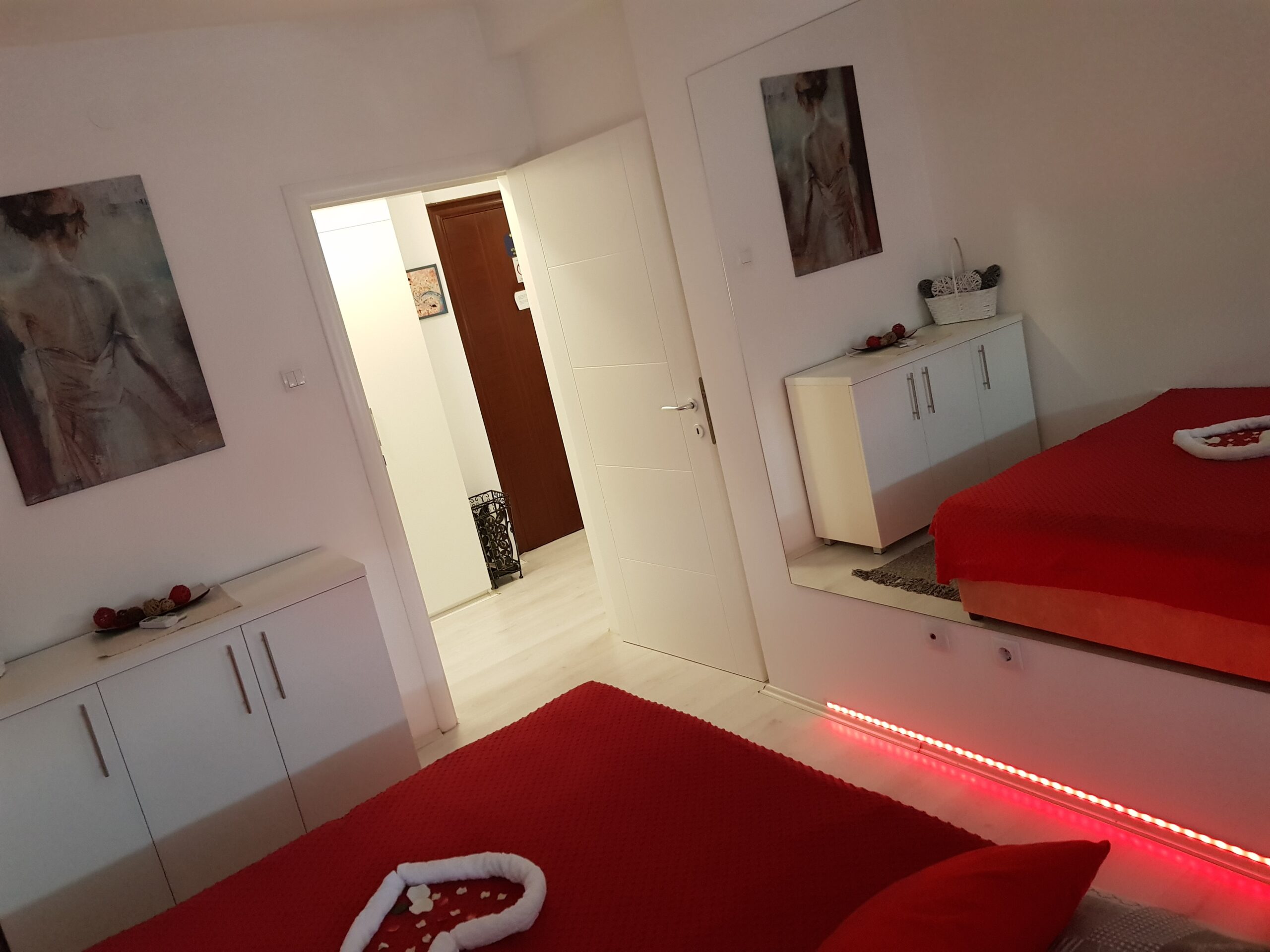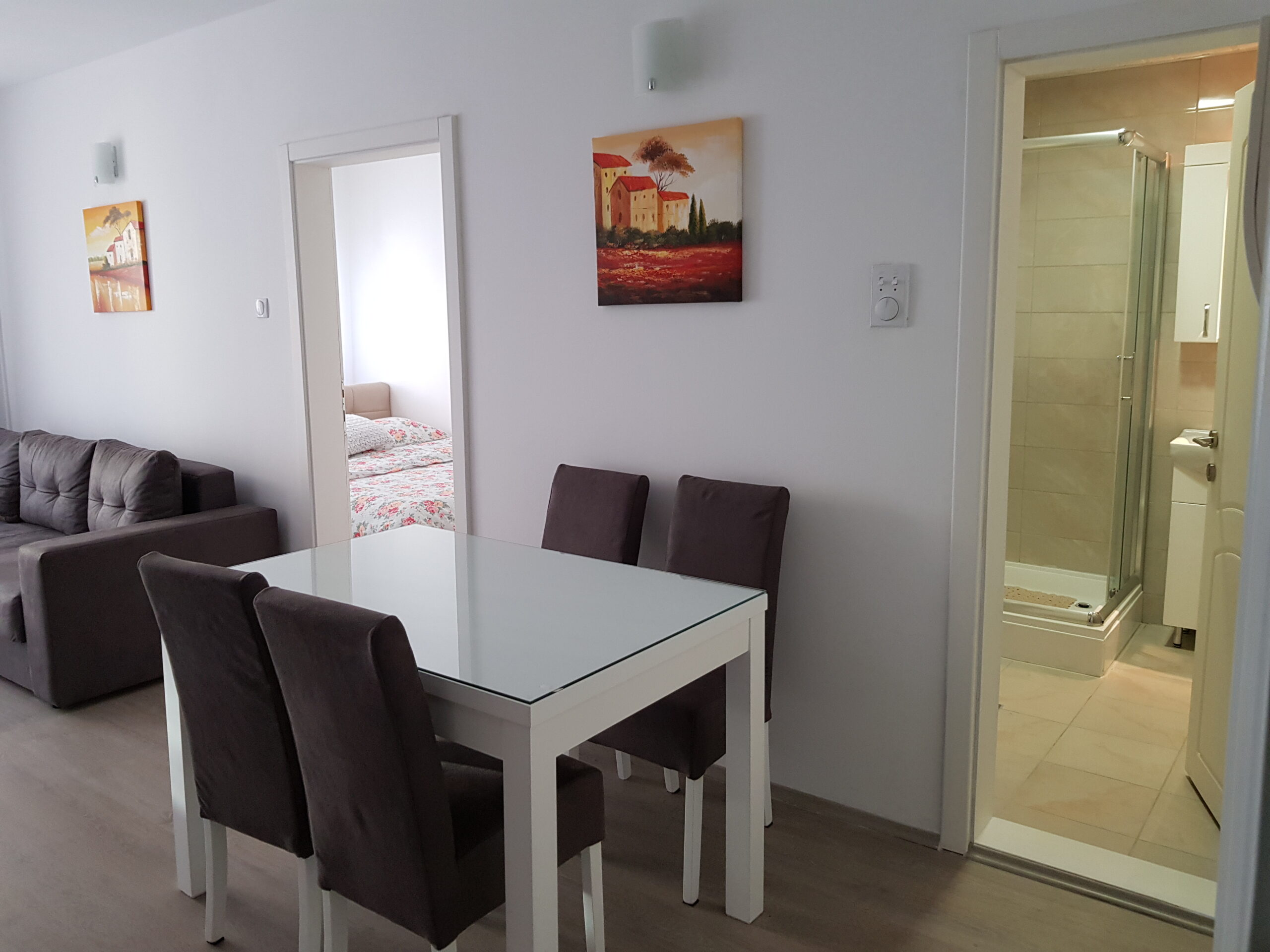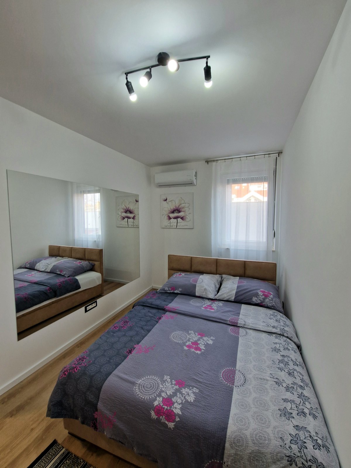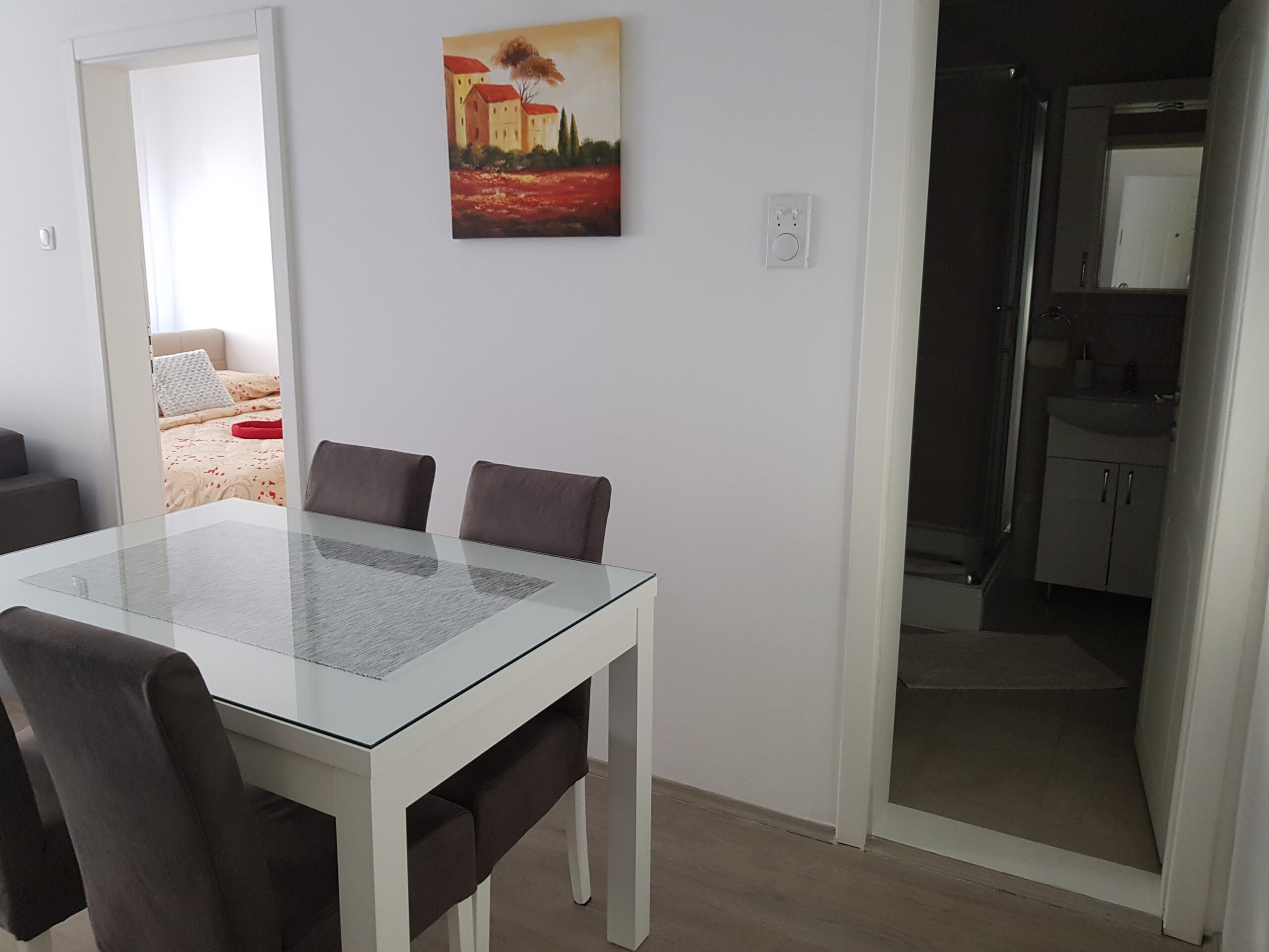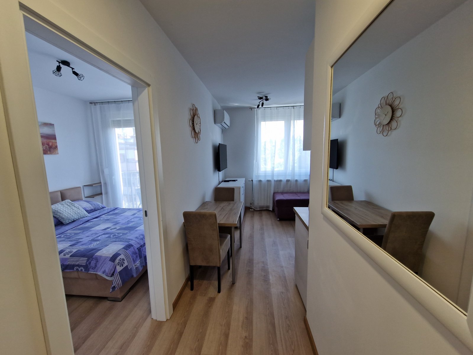 Nov, jednosoban apartman, nalazi se na trećem spratu zgrade sa liftom, kompletno opremljen, komforan, sa velikom terasom. Iako najmanji po površini, izuzetno je funkcionalan i pogodan za kvalitetan odmor. Terasa gleda na bočnu ulicu, što obezbeđuje mir i tišinu. Besplatan, javni parking se nalazi ispred zgrade. Sama lokacija je dobro povezana sa centrom grada i mnogim znamenitostima.